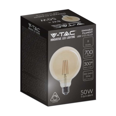 Żarówka LED V-TAC 8W Filament E27 Kula Glob G125 Bursztyn Ściemnialna 125x173mm VT-2018 2200K 700lm SKU 217155 VT-2018