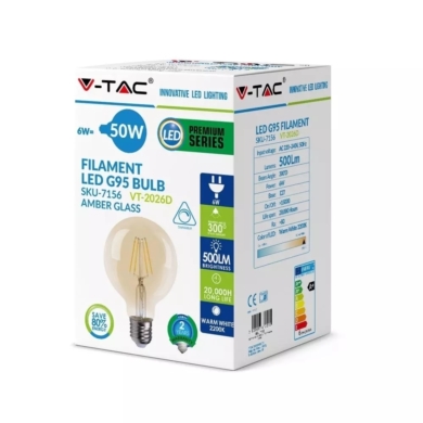 Żarówka LED V-TAC 6W Filament E27 Kula G95 Bursztyn Ściemnialna VT-2026D 2200K 600lm SKU 7156 VT-2026D