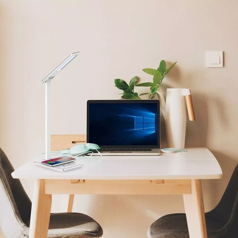 - Elegancka lampa stołowa z unikalną funkcją bezprzewodowego ładowania telefonów 5W