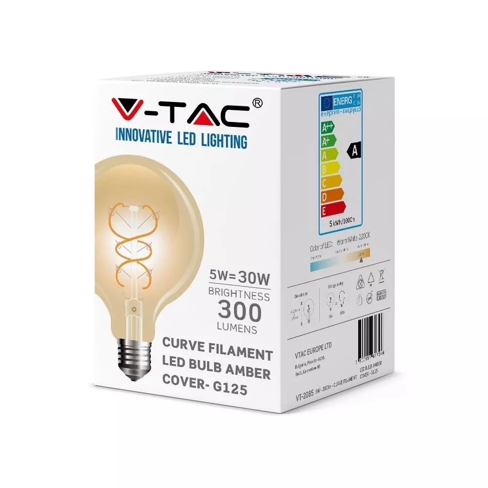 Żarówka LED V-TAC 5W Filament E27 G125 Złota VT-2085 2200K 300lm