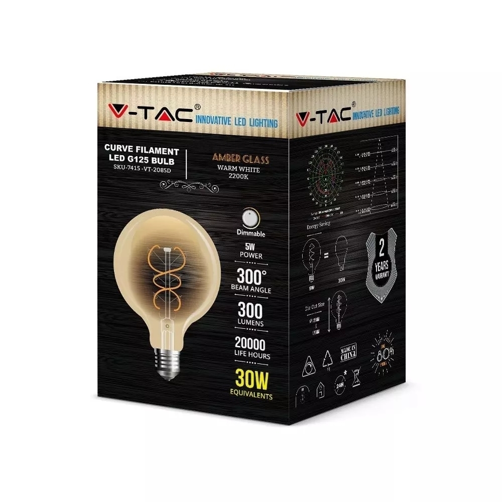Żarówka LED V-TAC 5W E27 Filament Bursztynowa Kula G125 Ściemnialna VT-2085D 2200K 300lm