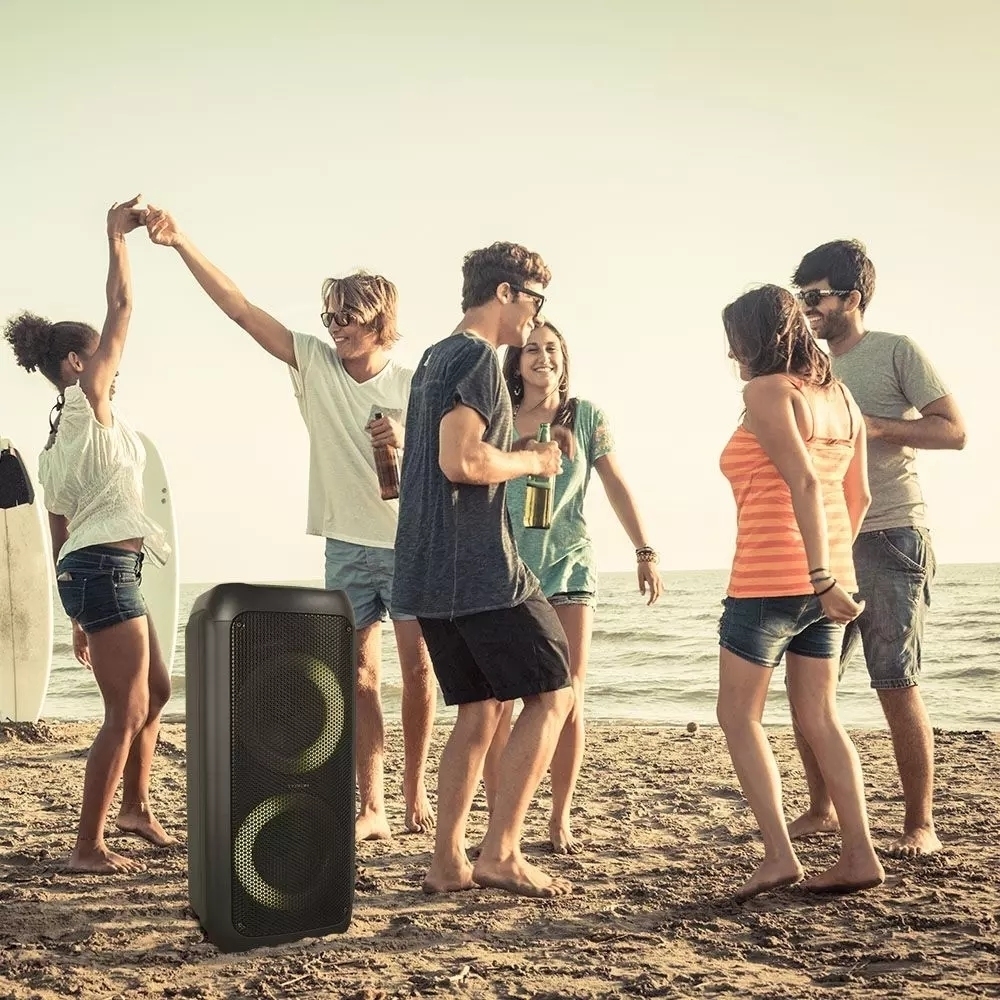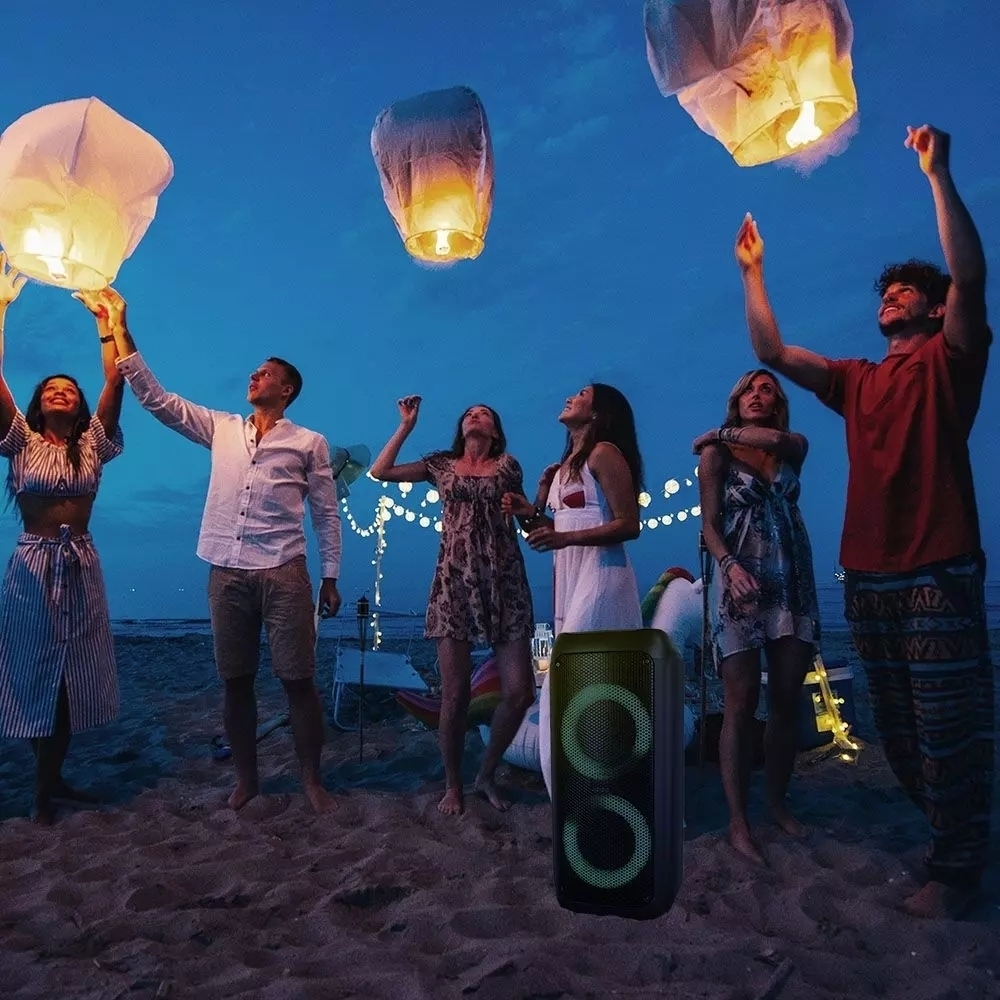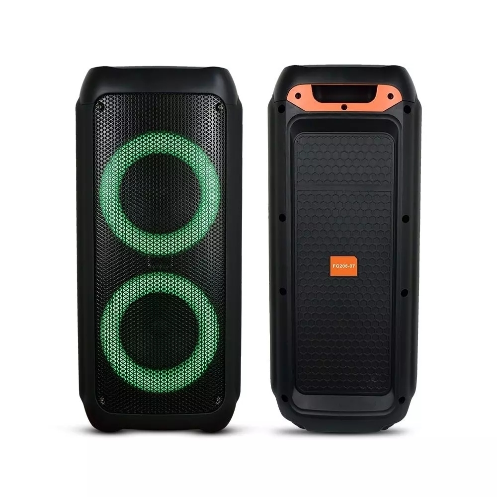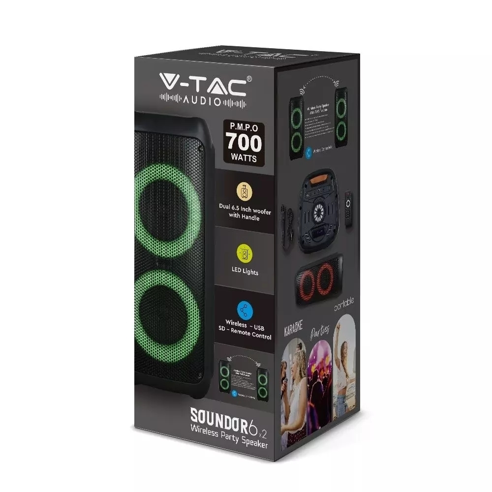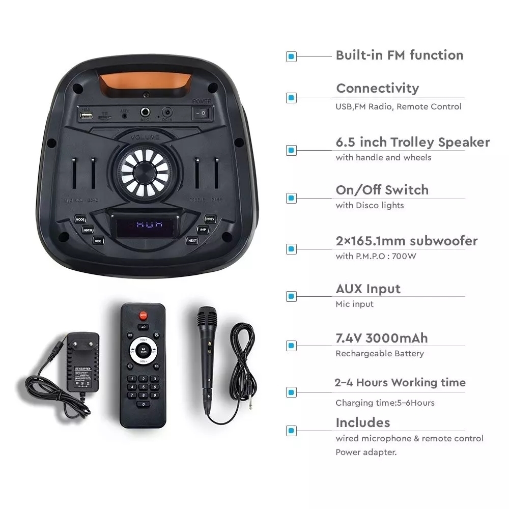 - Głośnik z możliwością ładowania z podwójnym 6,5-calowym głośnikiem , uchwytem do przenoszenia i kółkami