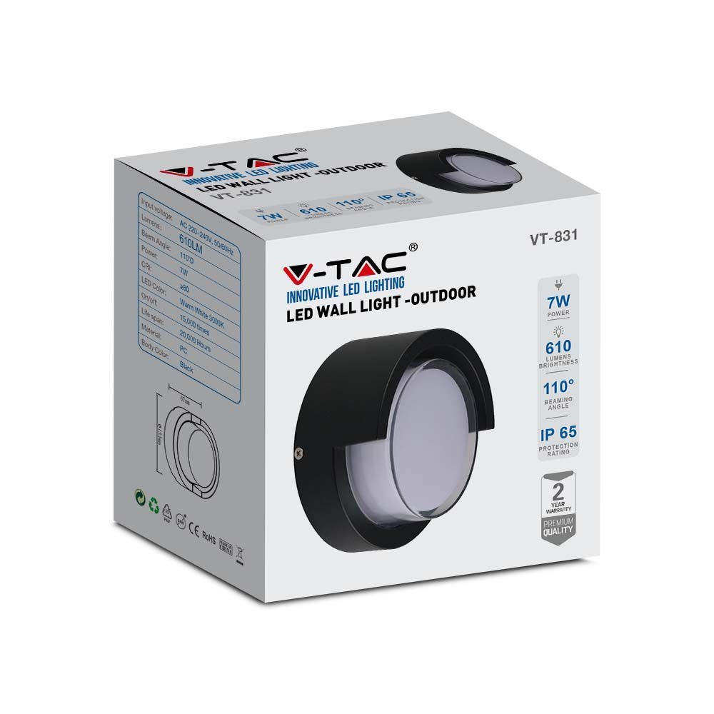 Oprawa Ścienna V-TAC 7W LED Czarna Okrągła IP65 VT-831 3000K 610lm