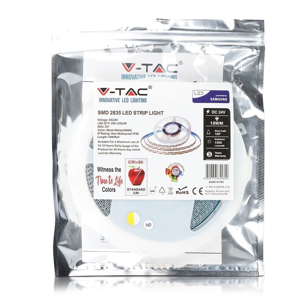 Taśma LED V-TAC SAMSUNG CHIP 2835 1200LED 24V IP20 CRI95+ 10mb 18W/m VT-10-240-1 3000K 1500lm 3 Lata Gwarancji