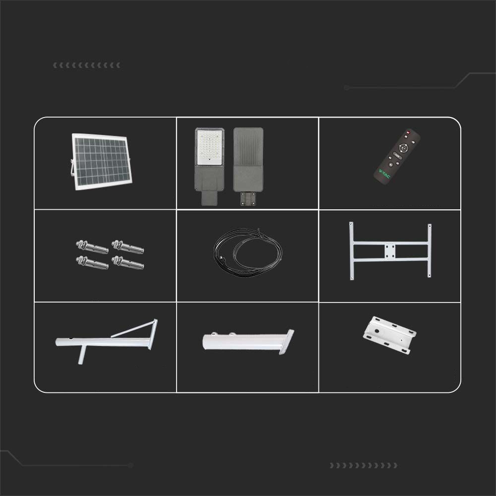 - Zestaw zawiera: Oprawa, ramie montażowe, przewód 1,5mb, śruby, wspornik, panel słoneczny, pilot