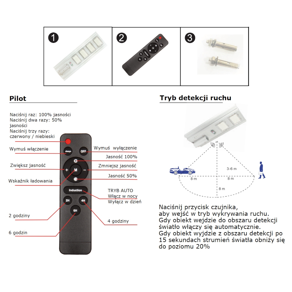 - Czas pracy 8-10 godzin w trybie ciągłego świecenia, 12 godzin w trybie czujnika ruchu