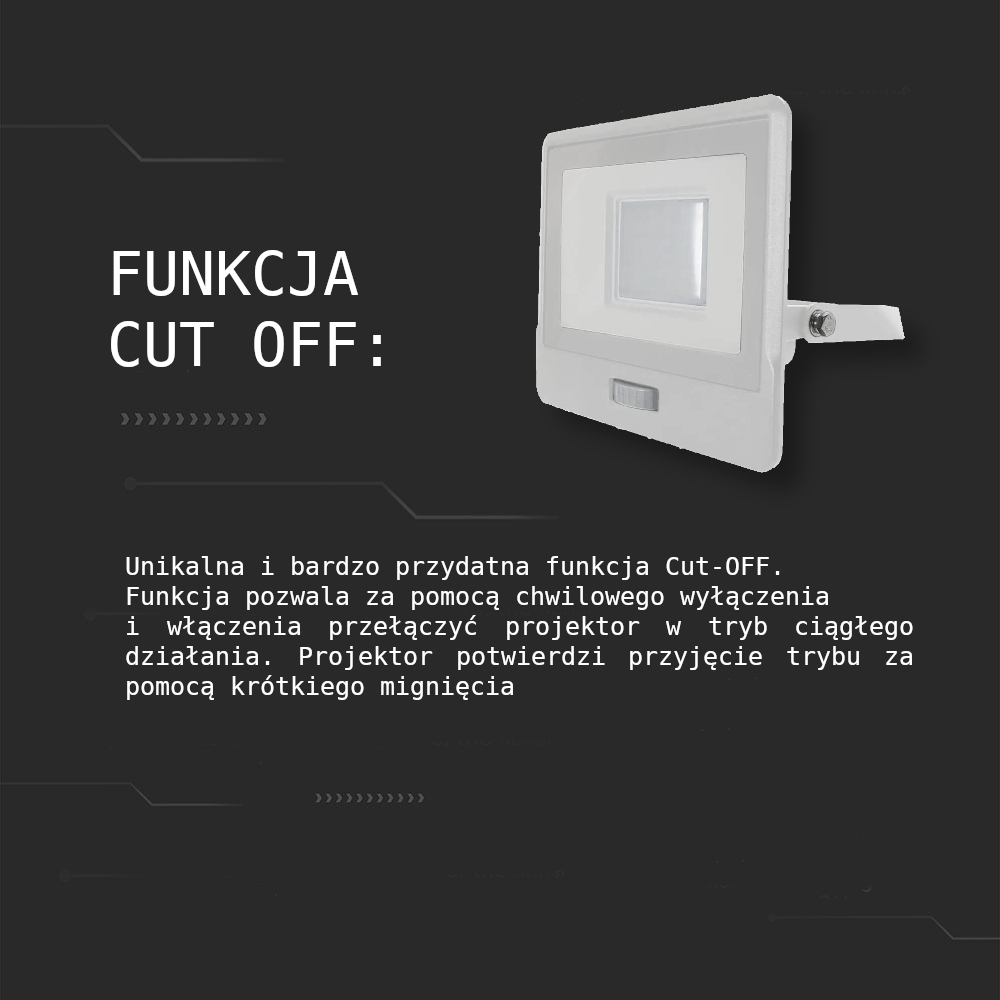 Unikalna i bardzo przydatna funkcja Cut-OFF. Funkcja pozwala za pomocą chwilowego wyłączenia i włączenia przełączyć projektor w tryb ciągłego działania. Projektor potwierdzi przyjęcie trybu za pomocą krótkiego mignięcia